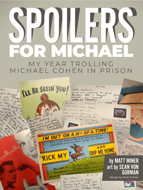 For the year Michael Cohen was in prison, I was mailing him postcards spoiling movies and pay TV shows. Everything from Stranger Things to Star Wars to Detective Pikachu. Cards paired with cartoons from Sean Von Gorman imagining Cohen’s life in prison while getting spoilers every couple days, it’s all combined into a coffee table book for you to enjoy.
